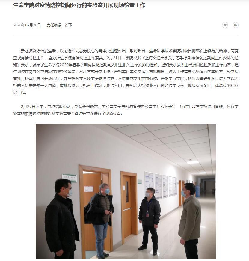 2月27日下午,由嵇紹嶺帶隊,副院長張曉君、實驗室安全與資源管理辦公室主任熊順子等一行對生命藥學樓進出管理、運行實驗室的疫情防控措施以及實驗室安全管理等方面進行了現場檢查。
