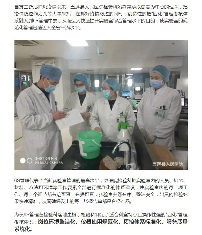 自發生新冠肺炎疫情以來,五蓮縣人民醫院檢驗科始終秉承以患者為中心的理念,把疫情防控作為頭等大事來抓,在抓好疫情防控的同時,創造性的把“四化”管理考核體系融入到6S管理中去,從而達到快速提升實驗室綜合管理水平的目的,