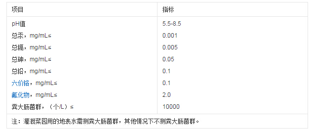 《綠色食品產地環境質量》規定了灌溉水的pH值、總汞、總鎘、總砷、總鉛、六價鉻、氟化物、化學需氧量、石油類、糞大腸桿菌等污染物的指標要求。
