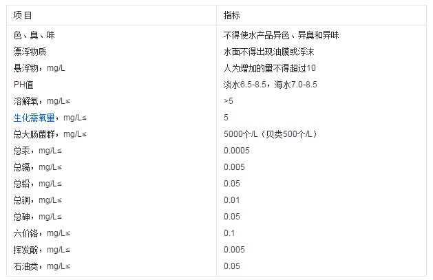 綠色食品產地漁業用水中各項污染物含量不應超過下列表中的濃度值:
