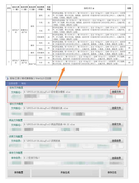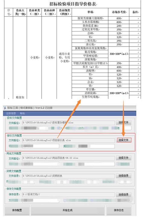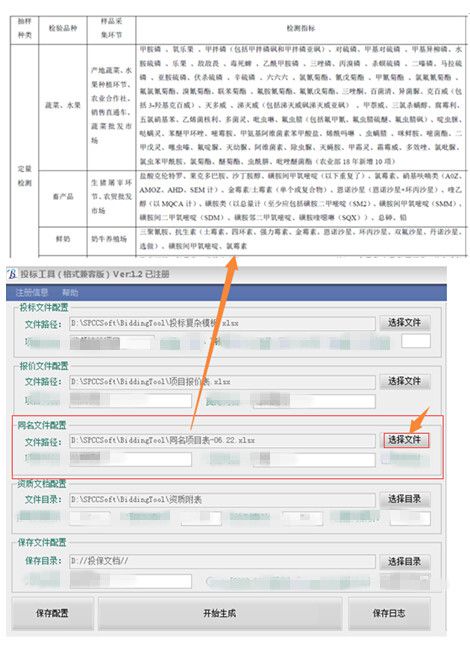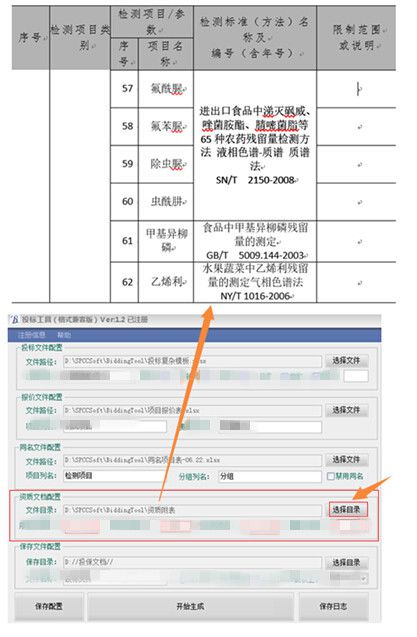 選擇要生成的投標文件路徑,然后在“項目列名”中配置投標文件中的檢測項目列名,如果投標文件中的項目是放在一起用符合隔開的,請選擇分隔符即可;